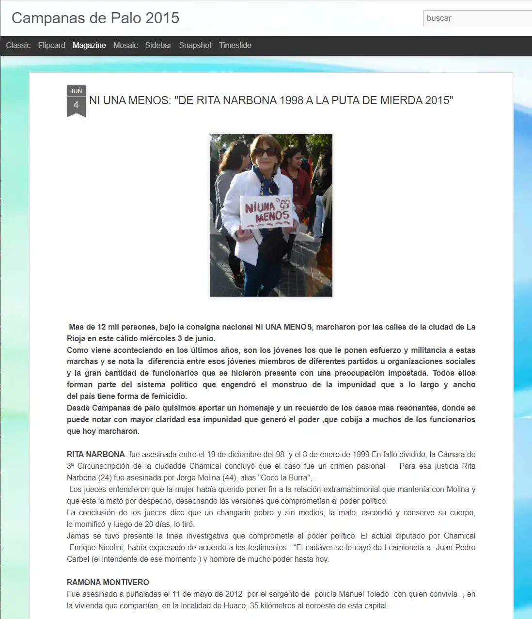 A Rita Narbona la violaron, asesinaron y luego momificaron su cuerpo en Chamical, Provincia de La Rioja. El pueblo se movilizó reclamando que esto era un ejercicio popular que se venía realizando desde la última dictadura. Intentaron hacerla pasar por prostituta; fue víctima del poder y muchas fuerzas se vieron implicadas, llegando el caso a la APDH. Se acusó a un hombre que apareció muerto en prisión, de quien el pueblo jamás creyó que estuviera implicado.