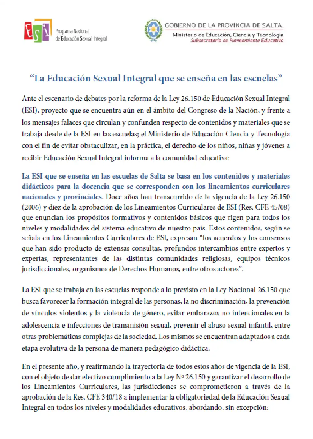Salta fue una de las últimas provincias en implementar la ley de Educación Sexual Integral, muchos fueron los gestos en torno a la disconformidad de su implementación y en 2009 el Ministerio de Educación devolvió a Nación las cartillas y materiales de la ESI. En simultáneo se señalaba que dicha Ley es ideología de género y promueve, la iniciación temprana de la sexualidad corrompiendo la inocencia de las infancias.