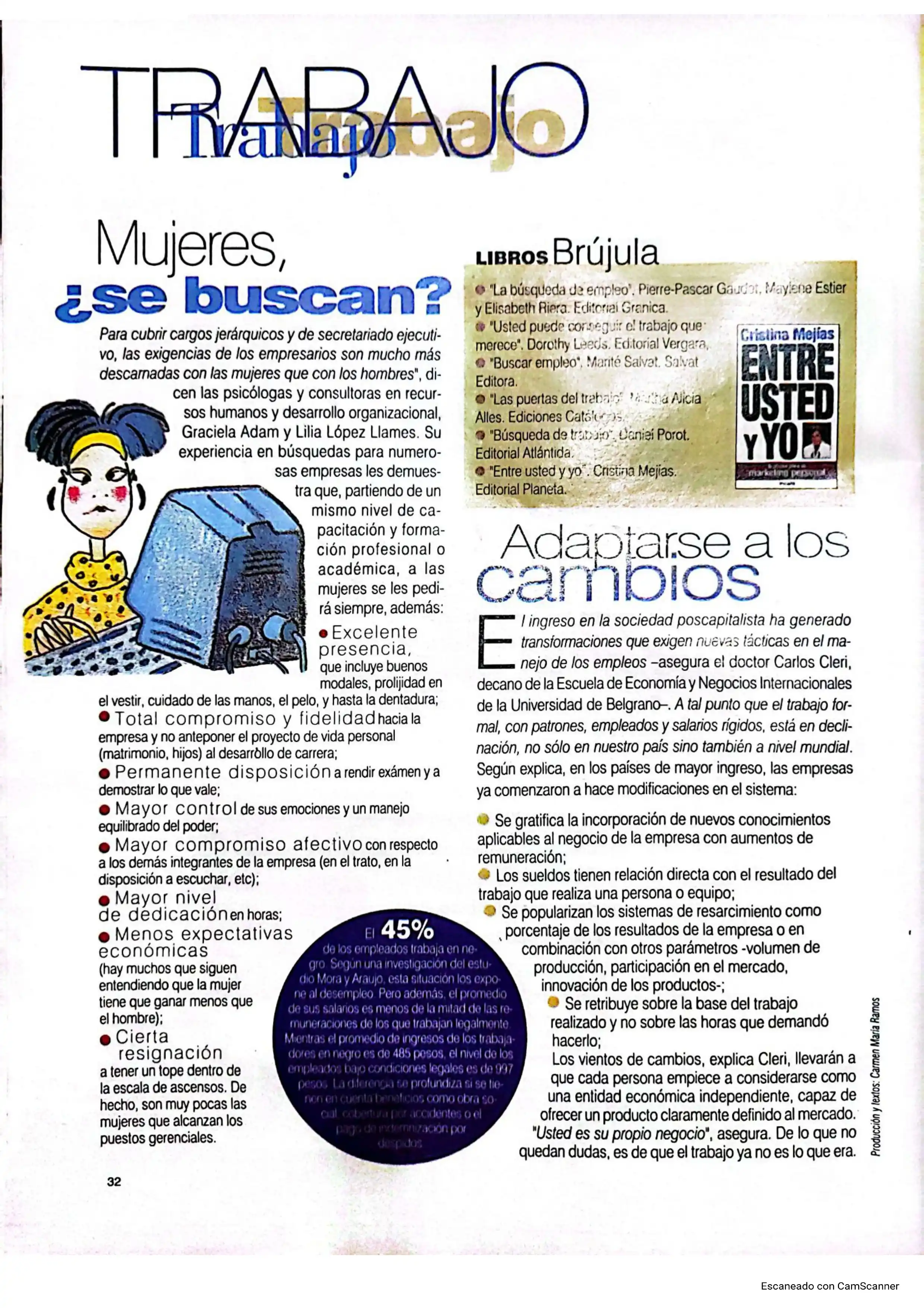 En un pequeño apartado de la revista, se exponen las diferencias, las mayores dificultades y demandas que las mujeres tienen en el trabajo, ya que se les exige más cosas partiendo del mismo nivel de capacitación y formación profesional que a los varones. Exigencias referidas al aspecto físico, el compromiso con la empresa por sobre sus proyectos personales/familiares), control de las emociones, trato con las personas, menores expectativas económicas, resignación de la posibilidad de ascenso en las empresas. Todas cuestiones que ponen de relieve las desigualdades de género que operan en ámbitos laborales (p. 32).
