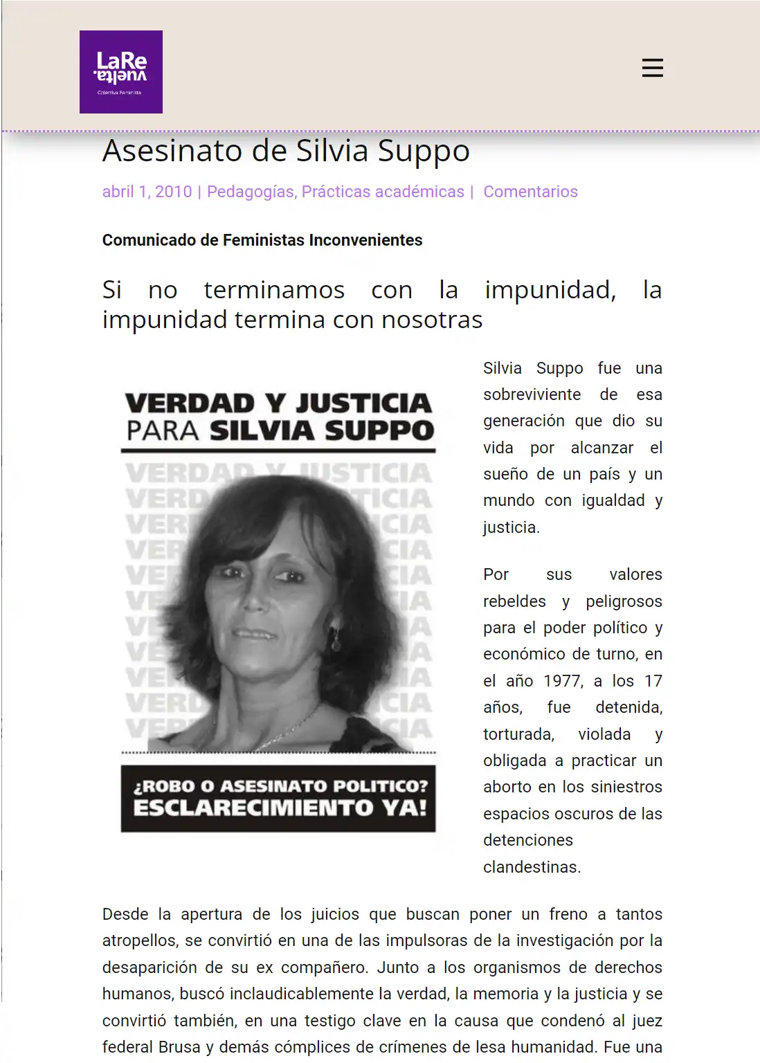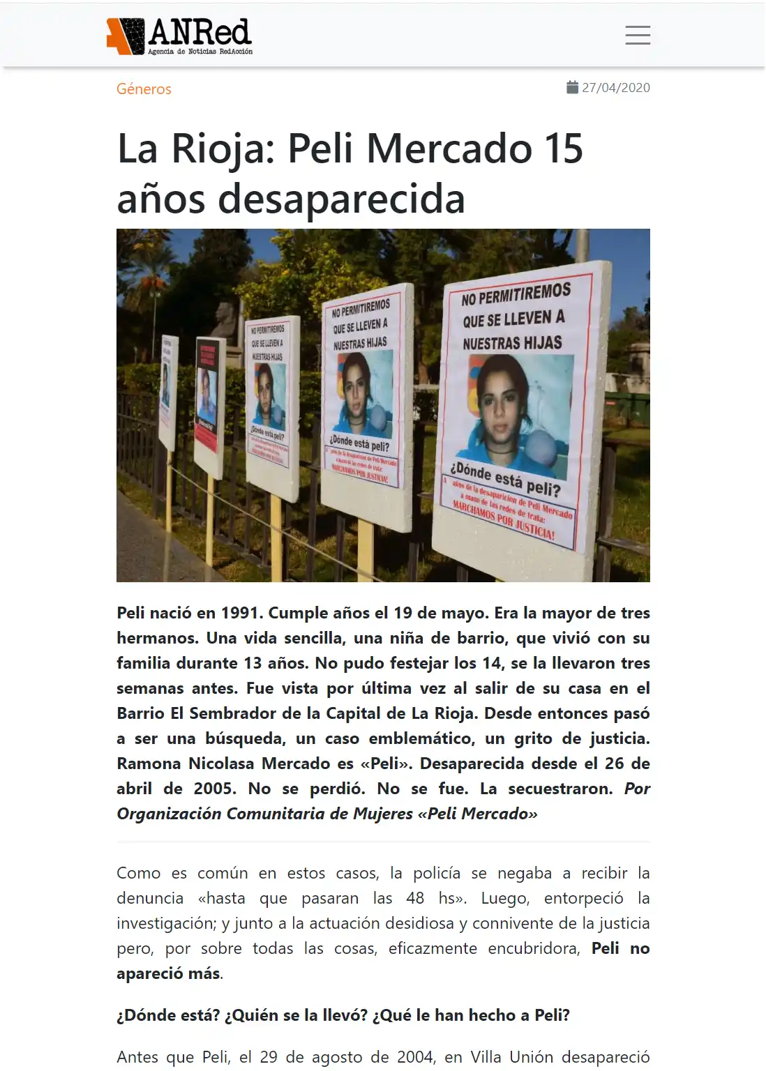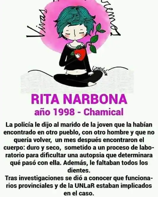 A Rita Narbona la violaron, asesinaron y luego momificaron su cuerpo en Chamical, Provincia de La Rioja. El pueblo se movilizó reclamando que esto era un ejercicio popular que se venía realizando desde la última dictadura. Intentaron hacerla pasar por prostituta; fue víctima del poder y muchas fuerzas se vieron implicadas, llegando el caso a la APDH. Se acusó a un hombre que apareció muerto en prisión, de quien el pueblo jamás creyó que estuviera implicado.
