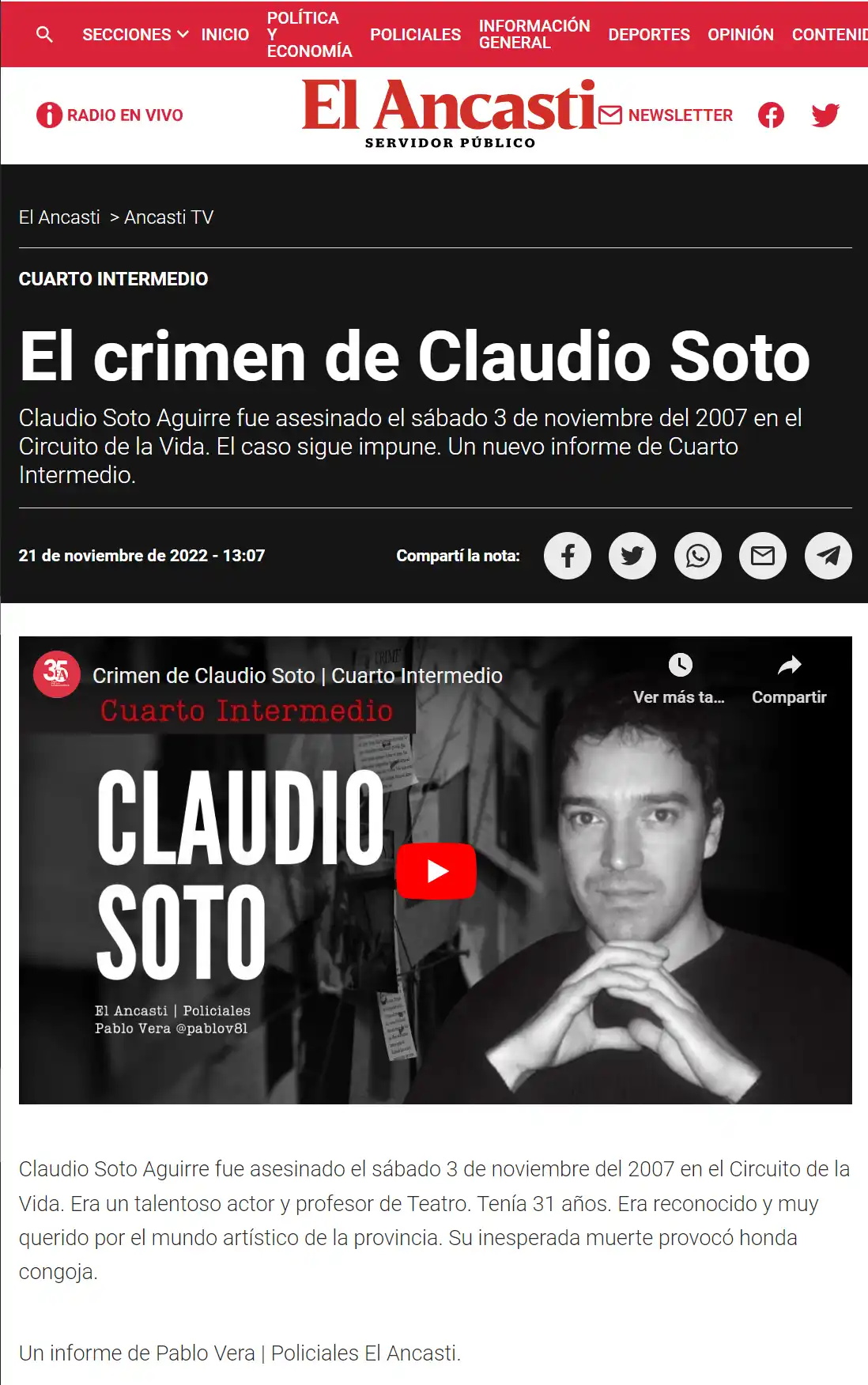 Claudio Soto, docente y actor catamarqueño, fue asesinado; hasta el día de hoy su crimen permanece impune. Las coberturas mediáticas pusieron el énfasis en la vida personal de la víctima. Por las características y los modos de estigmatización, se puede afirmar que se trata de un crimen de odio por razones de género. En democracia se cometieron 11 crímenes de odio en Catamarca y sólo 3 fueron elevados a juicio.