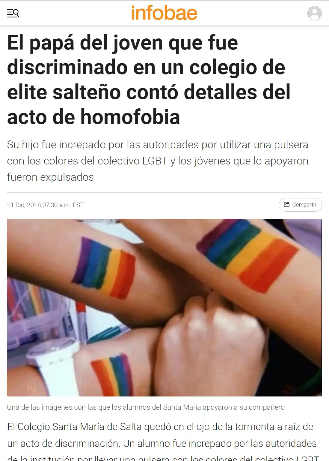 Discriminación en un colegio a adolescentes por llevar una pulsera lgbtiq+. El Colegio Santa María de Salta quedó en el ojo de la tormenta a raíz de un acto de discriminación. Un estudiante fue increpado por las autoridades de la institución por llevar una pulsera con los colores del colectivo LGBT y los compañeros que manifestaron su apoyo fueron expulsados.